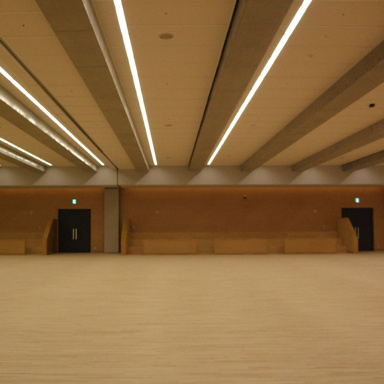 3年前に完成した「スカイホール豊田」の隣に武道館・サブホールが完成した(設計:松田平田設計)。武道館は直線のシンプルな光で、サブホールは障
