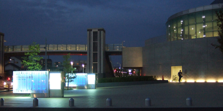 2007年竣工のメイン・ホ-ル、2010年竣工のサブ・ホールの2つのホールが揃い、スカイホール豊田が完成した(設計:松田平田設計)。建物外構照明の一貫として手掛けた施設入口のサイン照明は、ホールの活動を広く市民に知ってもらう役割だけでなく、街角アートの役割も果たすようデザインした(担当:野澤)。