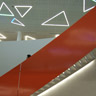 工学院大学八王子校舎スチューデントセンター竣工(設計:山本・堀アーキテクツ)。遠く富士山を臨む傾斜地に建てられた地下1階地上3階の開放的な建物。3角形の器具をランダムにつり下げた広い食堂には、緑と青のカラー蛍光灯で遊び心を加えた。