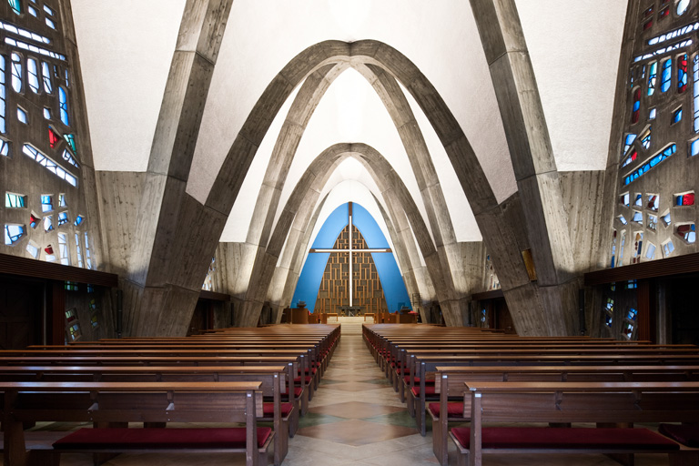 厳粛な雰囲気があり背筋がすっと伸びる空間です。常に十字架だけは照らされており、礼拝に訪れた人を温かく迎え入れています。