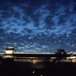金沢城は、その中心となる城の大部分を130年ほど前に消失してしまい、長い間荒れ果てた石垣と門が残されたままになっていた。 今回、金沢城の正門と外堀の復元と共に、周囲の石垣を加えた金沢城へのライトアップが完成し、ようやく、金沢城の在りし日の広大な城のスケールを目の当たりにできるようになった。石垣には3200Kのセラミックメタルハライドランプ70W広角配光の投光器を使用。投光器具の上部に上方への光を70%カットする遮光板を取付け、石垣の上にある原生林に極力光が当たらないようにした。 歩道照明は、石垣が際立って見えるよう、柵の支柱の上部にオリナナルデザインのLED4Wを2灯入れた照明器具を2m間隔に取付けた。光の出る開口部は幅12センチ、高さ3.5センチ、前面に取り付けたスプレットレンズで光を3.5m×2m幅に広げ歩道面を照らしている。照明器具は昼間は柵の一部に同化して見える。 (こちらの記事もご覧ください)