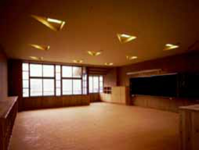 二つめは、子供たちが気軽に出入りでき、先生がゆったりと過ごせる職員室の照明の事。光源が全く見えない吊下灯で、机上を明るくする事に加えて、天井を照らす間接照明で、部屋全体が柔らかい光で包まれるようにした。